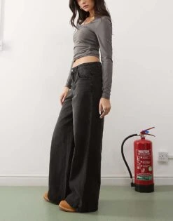 Noisy May Andy Low Rise Wide Leg Jeans In Washed Black For Women